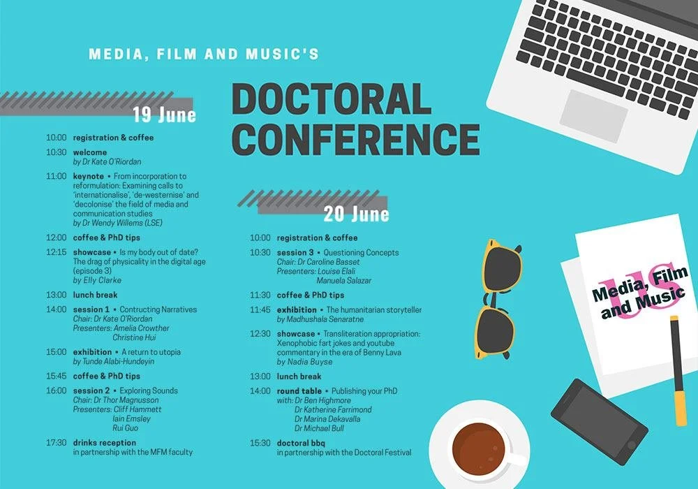 The MFM Doctoral Day is an annual event when PhD students from the School of Media, Film and Music have the opportunity to share the major advances in their researches, network and hang out. This year, Doctoral Day grew into a two-day event (hence the re-branding as Doctoral Conference), as a means to offer space to alternative formats, so we can better showcase the interesting projects currently happening at the school. So we invite you to explore more of the MFM community in the next two days. We are hosting three thematic panels: Constructing Narratives, Exploring Sounds, and Fashioning Identity, which are a great opportunity to hear about the research in progress by doctoral researchers. Alongside these traditional presentations, we will also showcase exhibitions by fellow PhD students. As special guests, we have the keynote speaker, Dr Wendy Willems (LSE), whose research engages with debates on the ‘internationalisation’, ‘de-westernisation’, or ‘decolonisation’ of the field of media and communication studies; as well as MFM faculty members, who will share their experiences and offer advice on publishing your PhD in a round table format. We hope you will enjoy exploring the inspiring work of the MFM doctoral community with us.