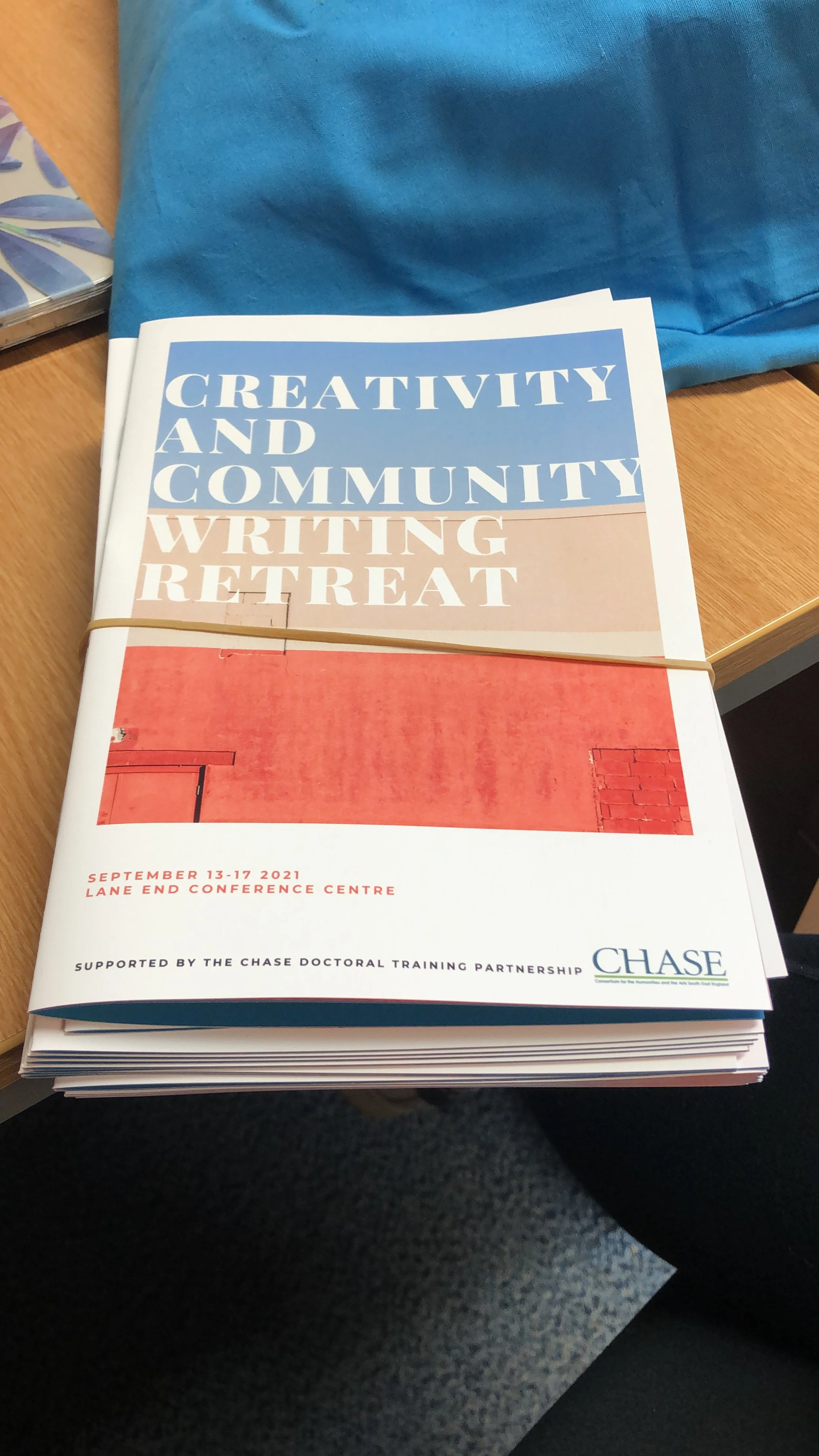 The 2021 Creativity and Community Writing Retreat was a chance for doctoral researchers to gather and work together after a period of 18 months of restrictions put in place by the Covid-19 pandemic. Long before the virus, the U-Doc, an extensive University of Sussex research project on the mental health of doctoral researchers in the UK, identified isolation to be one of the main issues doctoral researchers face in the completion of their degree. Its initial report states that “doing a PhD without social support is damaging”, and that doctoral researchers require a tangible, visible sense of collectively working in a community. Inspired by these findings and the general yearning amongst our peers for spaces to share and create collectively, we organised a 5-day, 4 night long writing retreat for Arts and Humanities Research Students (CHASE and non-CHASE funded). It was clear to us that amongst our cohorts, there is a need for togetherness, sharing of skills and resources, and a space to work together towards achieving writing goals, especially after we had been progressing in our doctorates in spite of all the restrictions imposed by the pandemic. A longer stay in a place surrounded by nature provided a change of pace and scenery, a quiet environment away from quotidian duties and the time needed for strengthening a sense of community amongst participants. Surrounded by beautiful lawns and providing all the necessary amenities needed for such a harmonious time, Lane End Conference Centre in High Wycombe was an ideal place to hold our retreat. This retreat also included structured facilitation from Kim Lasky, writer and Associate Researcher with the School of Global Studies at the University of Sussex, who holds a Creative Writing doctorate and who emphasises the value of writing retreats away from the distractions of home and university. A format was introduced for structured writing practice, to be used during timed writing sessions throughout the retreat, consisting of goal setting, writing time, and reflection.
