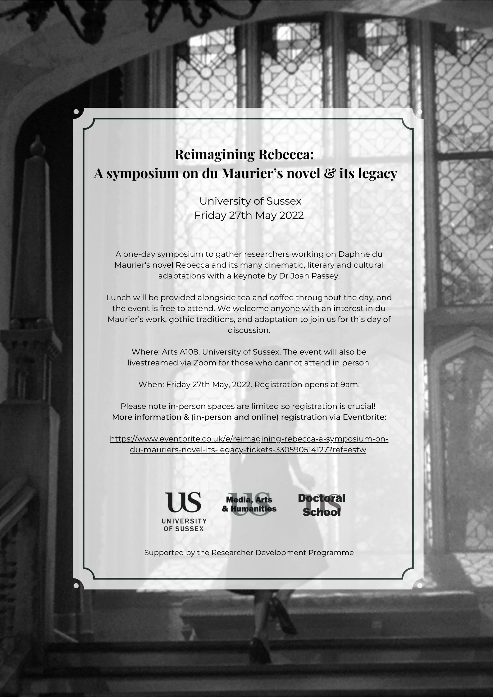 Together with Amelia Crowther I have co-organised the Reimagining Rebecca Symposium on 27 May 2022. The symposium attracted interdisciplinary papers across media, film, TV, music and book adaptations and papers from across the world. The symposium was fully funded by the University of Sussex Doctoral Development Fund and took place both in-person and was live-streamed.